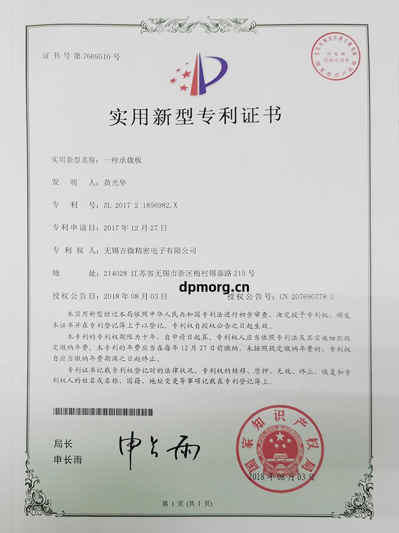 壹(yi)種(zhong)承(cheng)載(zai)板(ban)實(shi)用新(xin)型(xing)專(zhuan)利證(zheng)書