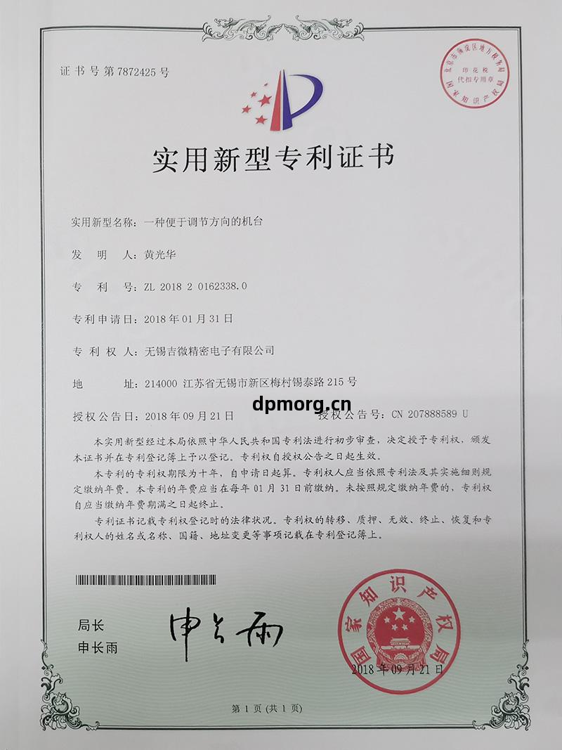 壹(yi)種(zhong)便(bian)於(yu)調節(jie)方(fang)向(xiang)的(de)機(ji)臺實用新型(xing)專利證書(shu)